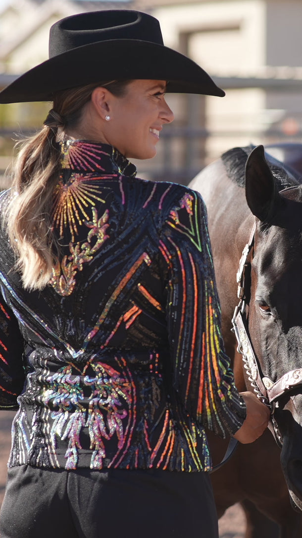 We think this jacket belongs on stage! Bold iridescent sequins bursting from the top of the shoulders draw the up and emulate epaulets. On a black stretch base with both iridescent and black sequins this jacket makes a colorful statement. Gussets in the sleeves and armpits provide for extra stretch and ventilation just where you need it. Also comes in girl’s sizing. Polyester/Spandex, hand wash. Made in the USA.