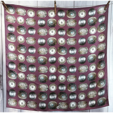 Wine/maroon background with silver conchos and hints of turquoise. Conchos range from 2" to 3.5"
