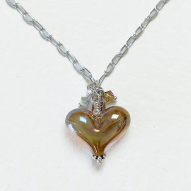 Handcrafted lampwork glass heart pendants made by artisan Jade McClendon of Studio BB Designs exclusively for Hobby Horse. Show your love for riding with these stunning necklaces. Necklace is on an adjustable 18” Sterling Silver Chain. Item is handmade for you and may vary from the photos. Please allow a week to ten days before your item will ship. No express shipping available due to custom nature of necklace.