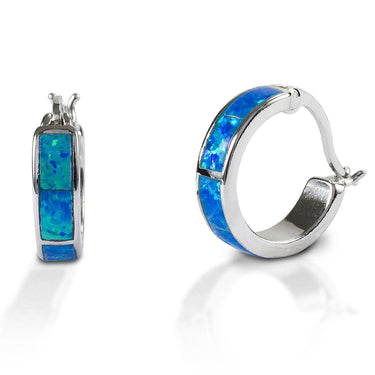Kelly Herd Blue Opal Hoop Earrings are wide hoops with inlaid opal. The earrings and wires are made of sterling silver.