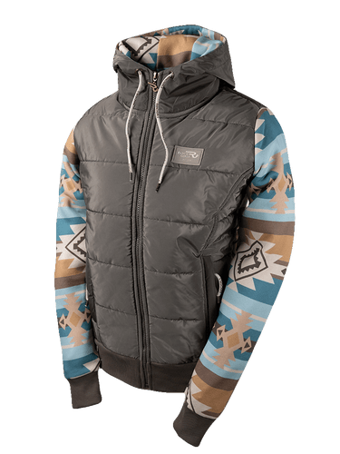 Ranch Girls Sweatshirt Pro Shield Jacket 'CAYLA' aztec / teal, in new Aztec / south-west pattern. The nylon trim is quilted onto the soft sweatshirt fabric and keeps you protected from water and wind. The hood is also trimmed with the same soft nylon. The hard-wearing yet soft nylon trim is also attached to the forearm. This area is often stressed when grooming horses. Soft ribbed cuffs at the hems feel comfortable and are elastic. This functional jacket in western riding style has a longer cut that offers space for a long-sleeved shirt or light clothing underneath. The sleeves are also cut long. It is not necessary to order the jacket larger, unless you want to wear it one size larger on purpose.