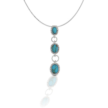 Looking for a sleek and elegant Southwestern look? The Kelly Herd Turquoise Drop Pendant Necklace offers a slimming look and features graduated lab created cabochon turquoise stones bezel set in sterling silver. This necklace is perfect for any occasion and will really add a flair for the southwest to any ensemble! Comes with a 16"-18" adjustable box chain.