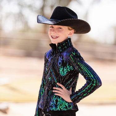 We think this jacket belongs on stage! Bold iridescent sequins bursting from the top of the shoulders draw the up and emulate epaulets. On a black stretch base with both iridescent and black sequins. Gussets in the sleeves and armpits provide for extra stretch and ventilation just where you need it. Also comes in women’s sizing. Polyester/Spandex, hand wash. Made in the USA.