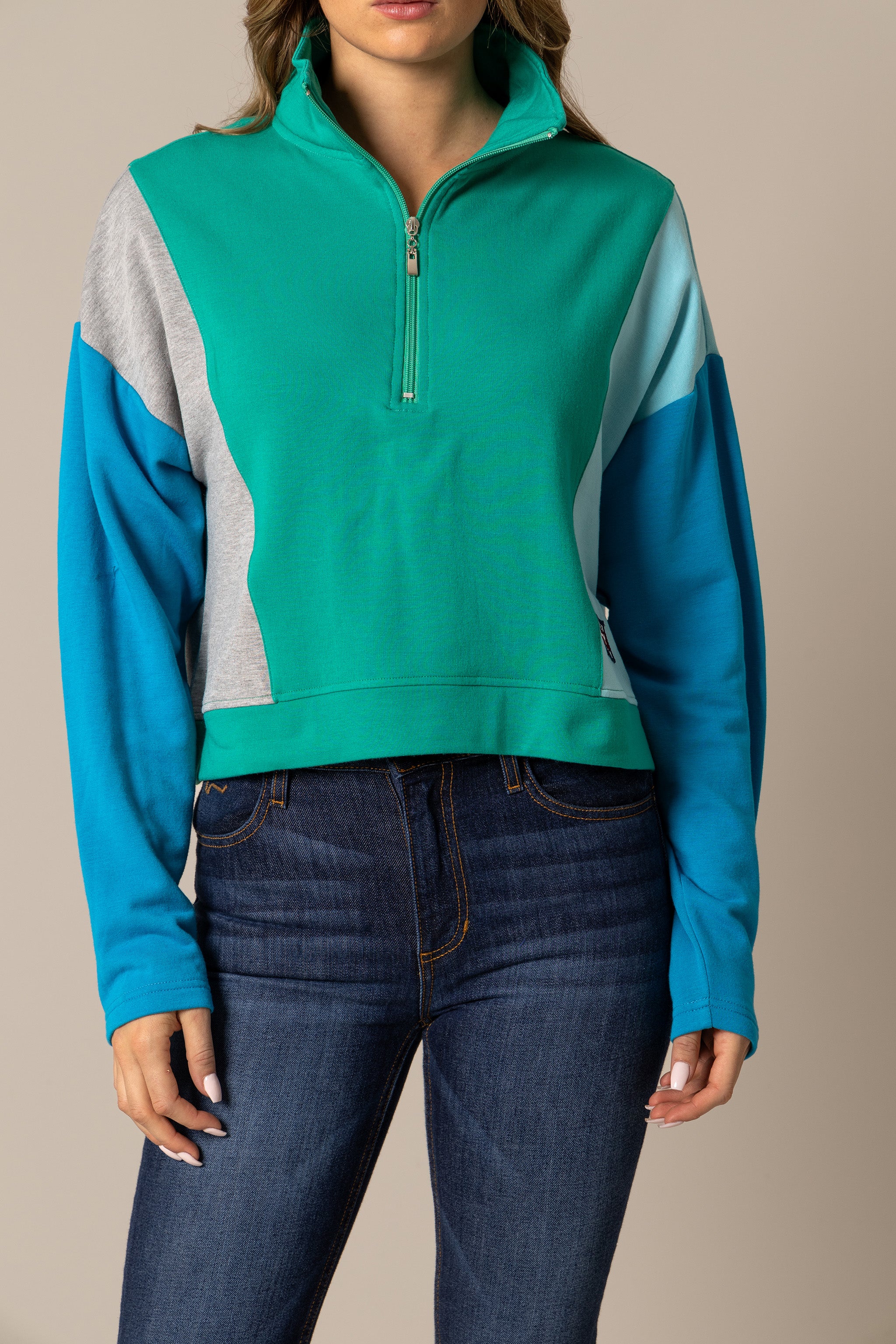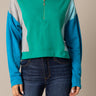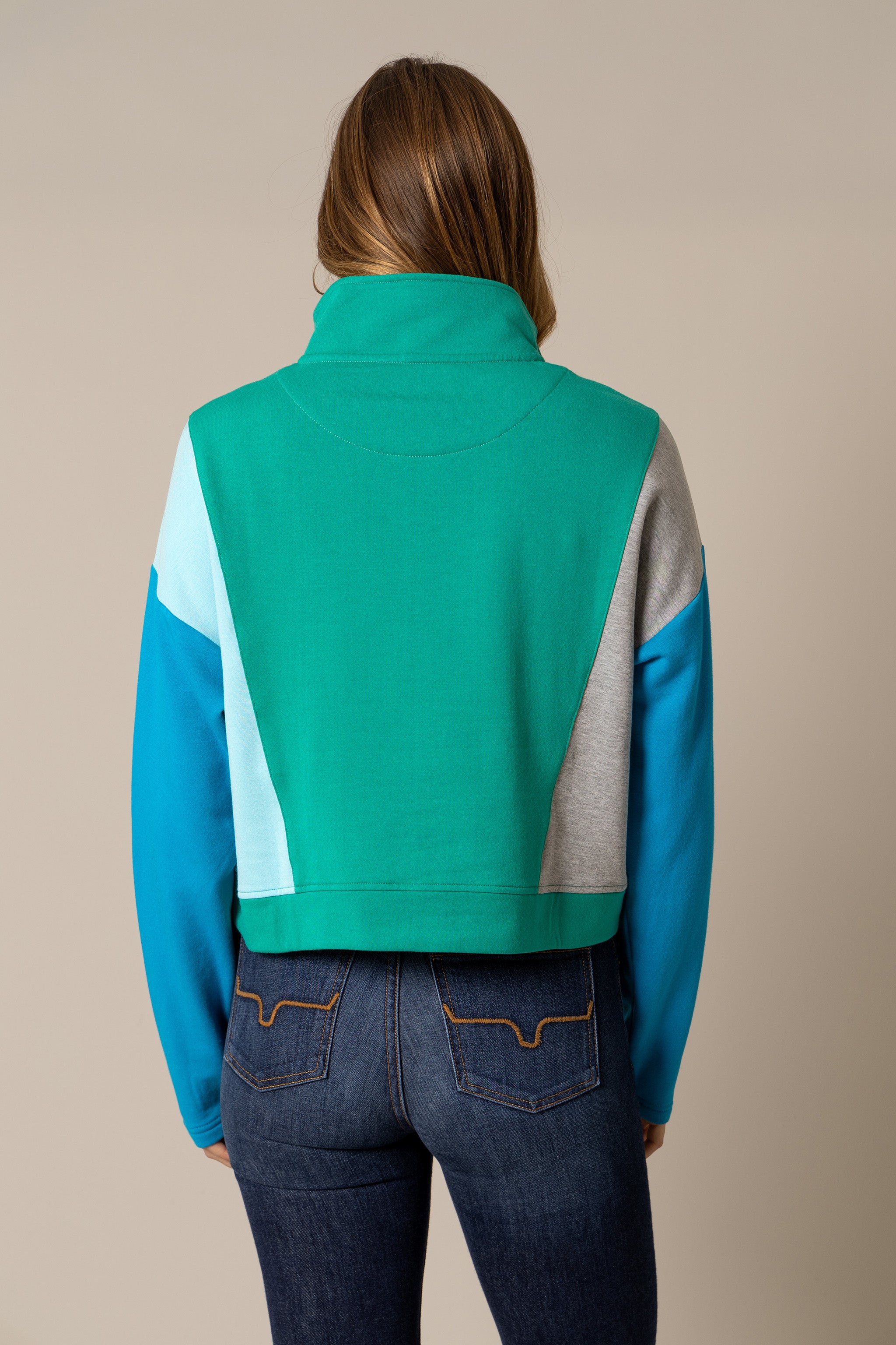 The Kimes Ranch Cami Zip Neck Pullover is a cropped style featuring a zippered neckline and colorblocked panels. It includes a Kimes Ranch brand patch and is made from a blend of 63% polyester, 33% rayon, and 4% spandex for a comfortable fit.