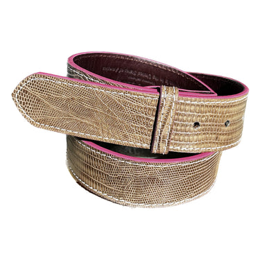Hand-selected lizard skin from Argentina is glazed using agate stones to give the small scale pattern an unassuming yet distinguished look. This skin is paired with a genuine leather backing to provide a supple feeling belt. Hand painted contrasting edges and stitching complete this heirloom-quality 1 1/2" belt. Exclusively from Handmade Exotics for Hobby Horse as shown. Includes velvet storage pouch. Even waist sizes 28-42" measured from fold to center hole. Made in the USA. Item will ship separately. Please allow 8-12 weeks for delivery.