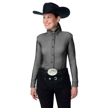 Perfect for all day wear in just about any event! Stretchy pinstriped fabric with darts give a custom looking fit. Added details like buttoned cuffs, high collar, zip front with faux button cover complete with added tiny snaps to hold it in place, and built in shoulder pads, all make this a ready-to-win look! If between sizes, size down for more fitted look.59% Nylon, 28% Polyester, 13% Spandex