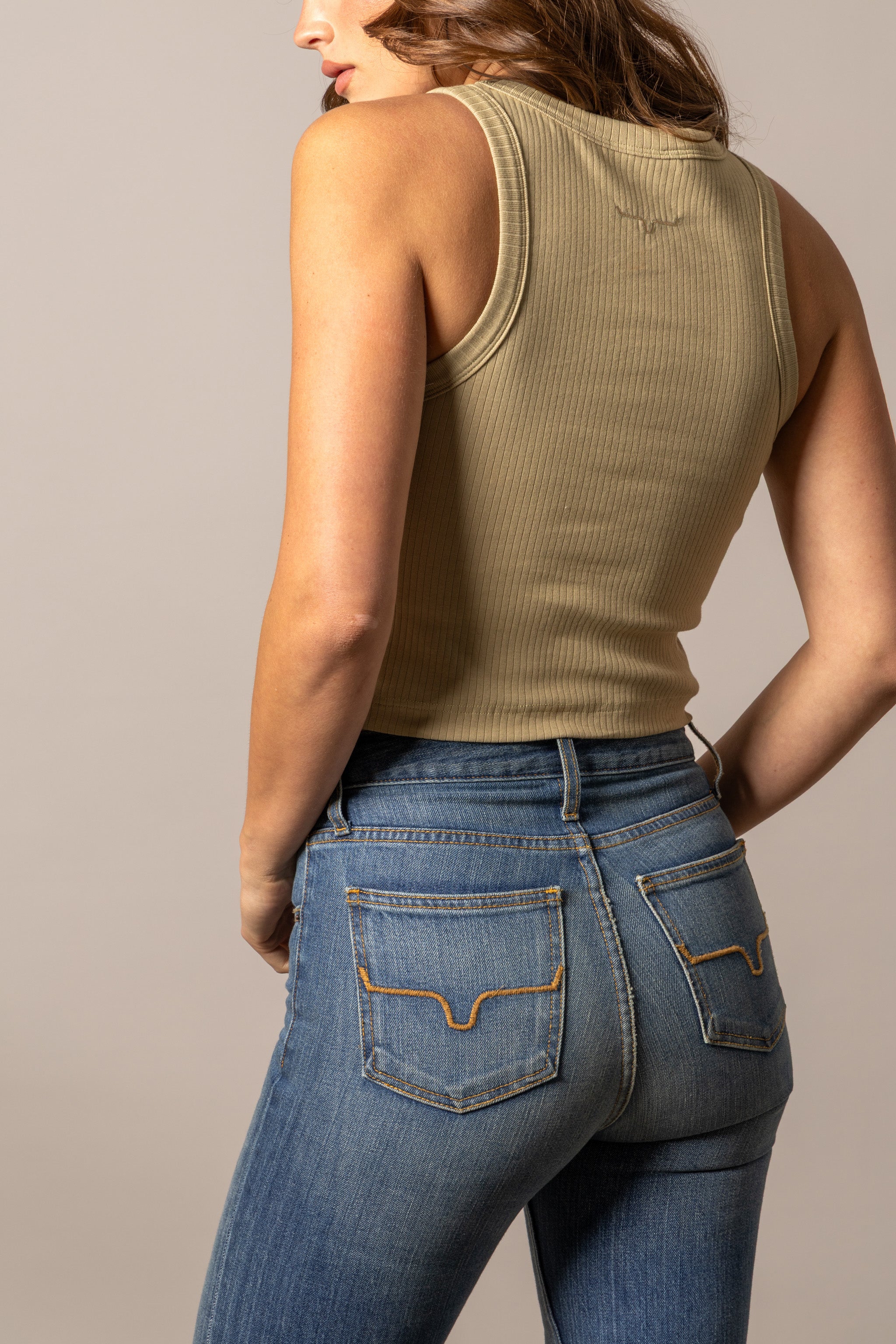 Stretch rib racerback tank with high neckline and built-in shelf bra. Finished with the signature horn logo at the upper back.