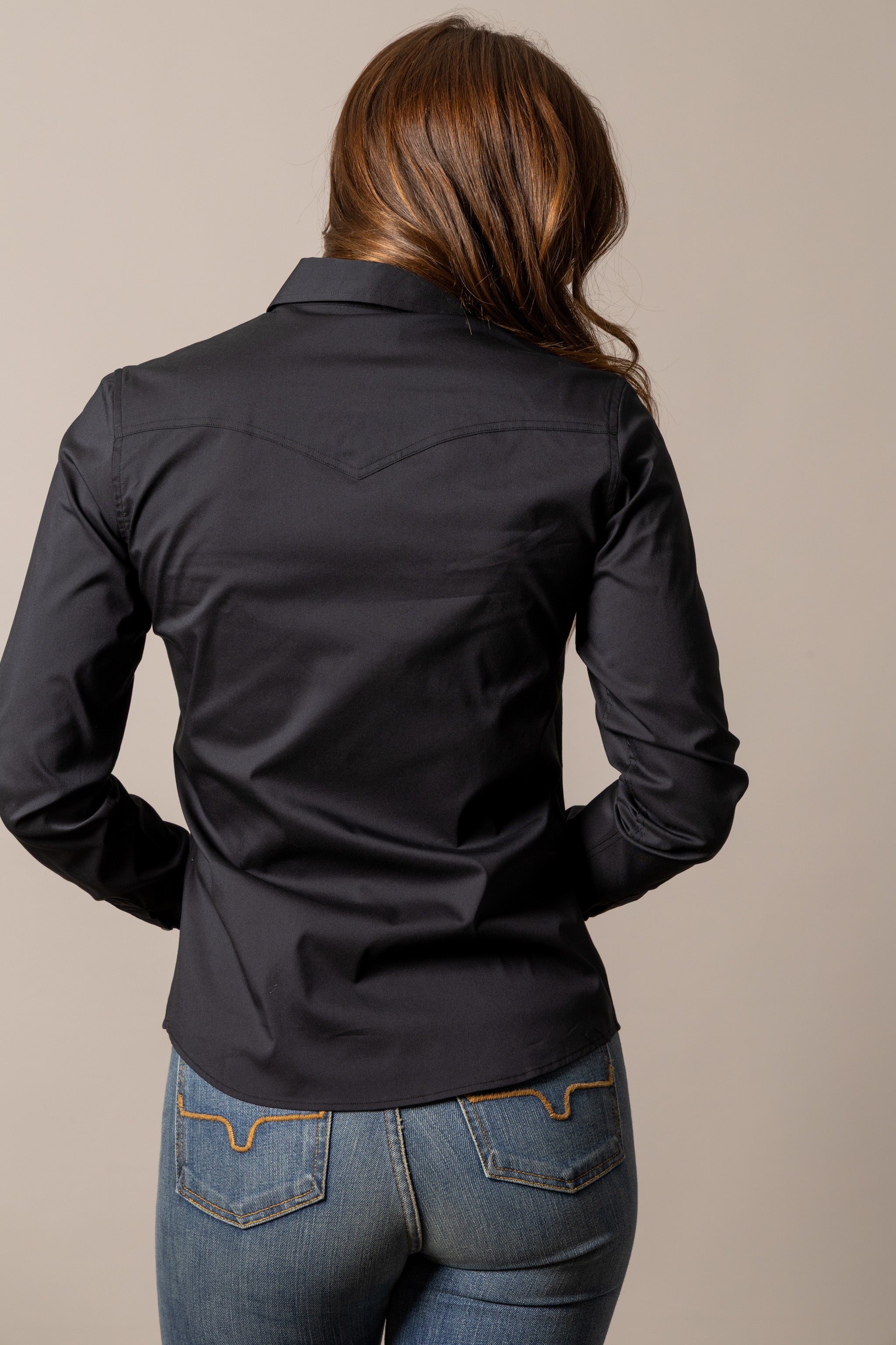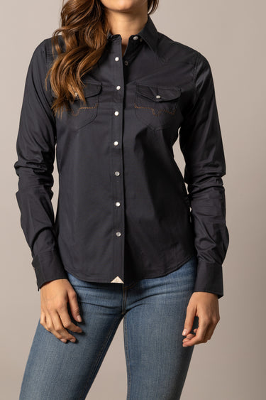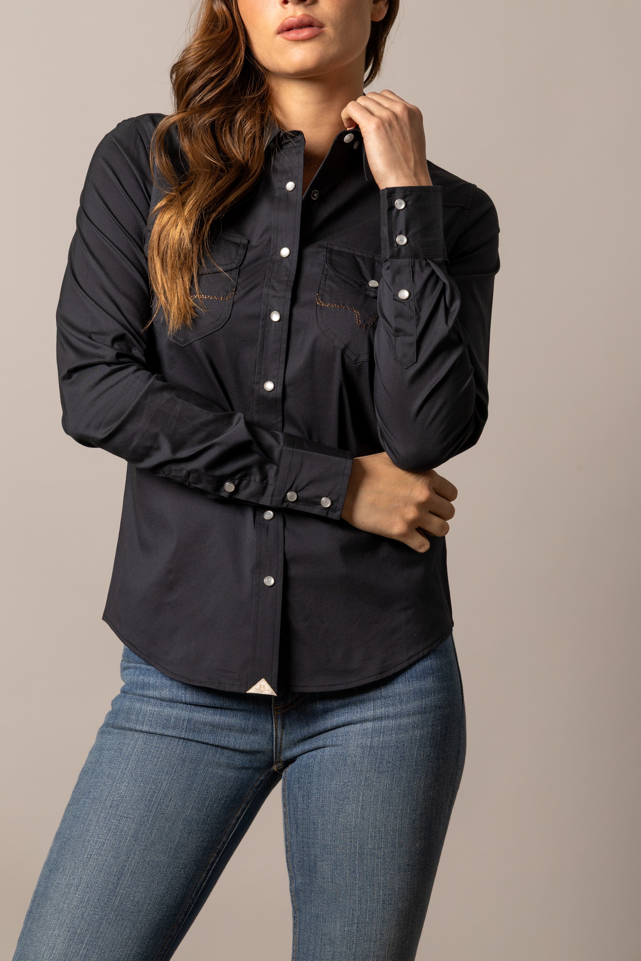 Long sleeve performance stretch shirt with Coolmax technology western yokes, double patch and flap chest pockets with logo stitching and snap closures.