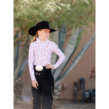 Tiny pastel pink blossoms adorn this HobbySport technical fabric that will stay bright after repeated washings and doesn't even need to be ironed! Unbelievably soft against your skin, while also wicking away moisture. Pair with our chocolate or black chaps to complete the look. For a Mother-Daughter matching look available in ladies sizing. Made in the USA. 86% Polyester 14% Spandex. Hand wash.