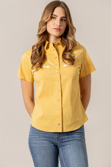 Talk about style! This is a shirt that blends timeless Western details with modern comfort. This unique piece features a hidden surprise, a Long horn logo incorporated into the yoke, and vintage-inspired arrows at the front. This fitted shortsleeved button-up will never get old.