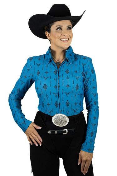 The Wynn HobbySport Blouse is definitely a winner! You’ll also want to checkout the Bentley Wynn Saddle Blanket that is PERFECTLY matching! Our HobbySport technical fabric will stay bright after repeated washings and doesn't even need to be ironed! Unbelievably soft against your skin, while also wicking away moisture. Also available in Girls sizes. 86% Polyester 14% Spandex, hand wash. Made in the USA.