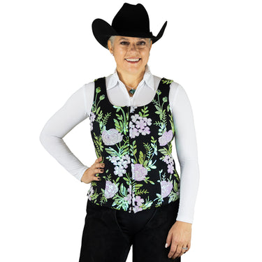 This slimming vest has a black stretch base with iridescent white and green flowers throughout. Pair with a black Taffy or White Solstice as underpinnings, a pair of black chaps, and our perfectly designed to match Bentley Saddle blanket in green for an absolutely winning combination!