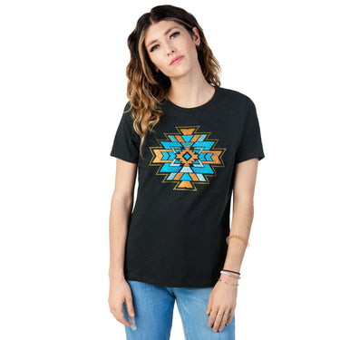Super soft and with a relaxed fit, the Shyla Tee will be a “go-to” top for riding at the ranch, a casual day out, or paired under a Hobby Horse sequined jacket for a night on the town. Features flitter appliqué pattern with crystal detailing. 100% Cotton. Made in the USA.