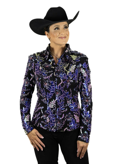 You won’t believe the details in the Flora Jacket! Mini pearl iridescent, layered piette, and bold indigo sequins in floral patterns adorn this gorgeous jacket. On a black stretch base with gussets in the sleeves and armpits to provide for extra stretch and ventilation just where you need it. You will also want to check out the perfectly matching Bentley Flora Saddle Blanket! 80% Polyester 20% Spandex, hand wash. Made in the USA.