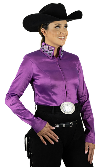 Building on our classic and versatile Taffy Blouse, we’ve added dynamic rhinestone details to the collar in AB, clear and black. The Shiloh Crystaled Taffy comes in stretch taffeta that is both fitted and stretchy with a touch of sheen. Polyester/nylon/spandex, hand wash avoiding crystals. Made in the USA. Hand wash only. 35% Nylon, 57% Poly, 8% Spandex.