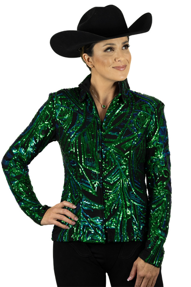 The Everest Jacket makes a bold statement! She elegantly mixed solid and similar toned iridescent sequins for a dynamic look. On a black stretch base with gussets in the sleeves and armpits to provide for extra stretch and ventilation just where you need it. You will also want to check out the perfectly matching Bentley Everest Saddle Blankets! 80% Polyester 20% Spandex,, hand wash. Made in the USA.