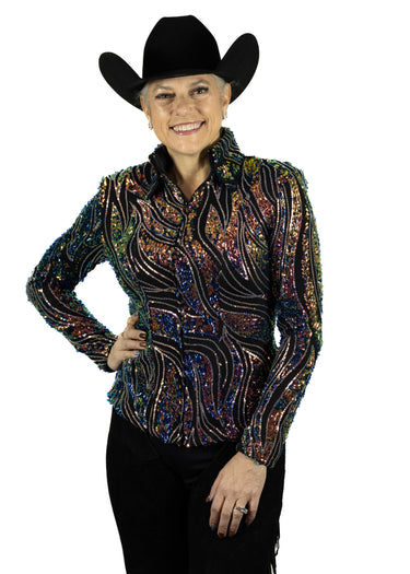 The Toni Jacket has a black stretch base with contrasting mini black sequins and bold textured metallic piette sequins! Gussets in the sleeves and armpits provide for extra stretch and ventilation just where you need it. Also comes in girl’s sizes. Polyester/Spandex, hand wash. Made in the USA.
