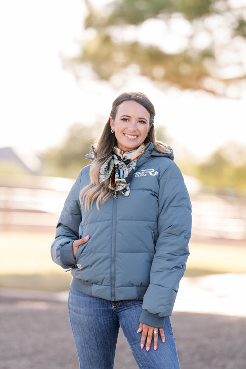 Wrap her in western warmth with cozy puffers, soft sweaters, and laid-back sweatshirts made for crisp mornings at the barn and fireside evenings after the ride.