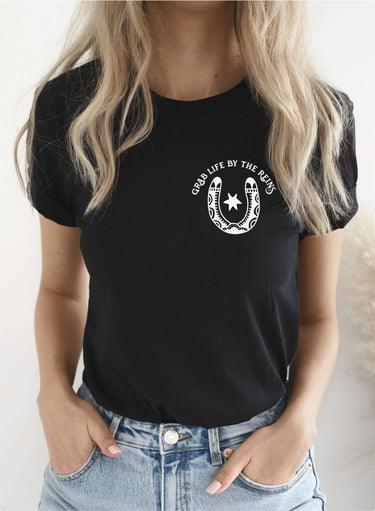 "Grab Life By The Reins Horseshoe" Our super soft crew neck tee's are so soft that you will love it from the moment you first put it on. Featuring a crew neck, short sleeve and made with 100% cotton.