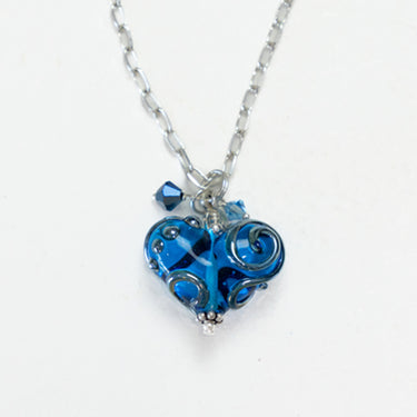 Handcrafted lampwork glass heart pendants made by artisan Jade McClendon of Studio BB Designs exclusively for Hobby Horse. Show your love for riding with these stunning necklaces. Necklace is on an adjustable 18” Sterling Silver Chain. Item is handmade for you and may vary from the photos. Please allow a week to ten days before your item will ship. No express shipping available due to custom nature of necklace.
